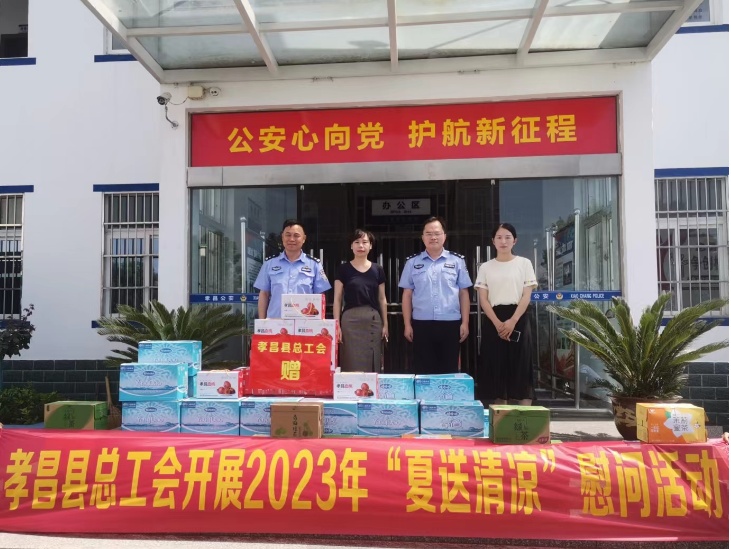 6月28日,孝昌县总工会启动2023年夏送清凉慰问活动,为在高温作业下坚守岗位的一线职工送去清凉与关怀。县总工会先后到卫店镇派出所、三三八物资储备处及环卫工人聚集地等地,走访慰问一线职工,为他们送去矿泉水、果茶等降温解暑物资。此次活动共为200余名一线职工送去价值1万余元的慰问物资。