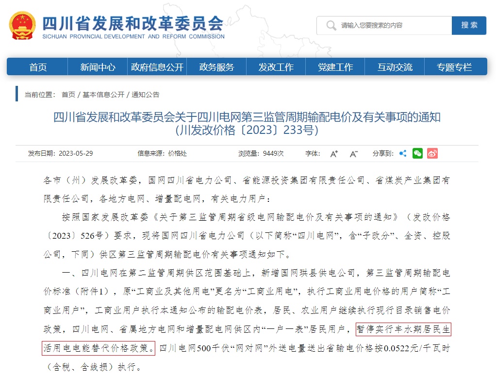 根据四川省发改委发布的《四川省发展与改革委关于四川电网第三监管周期输配电价及有关事项的通知》(川发改价格〔2023〕233号)(←详戳),四川电网、省属地方电网和增量配电网供区内“一户一表”居民用户,暂停实行丰水期居民生活用电电能替代价格政策。