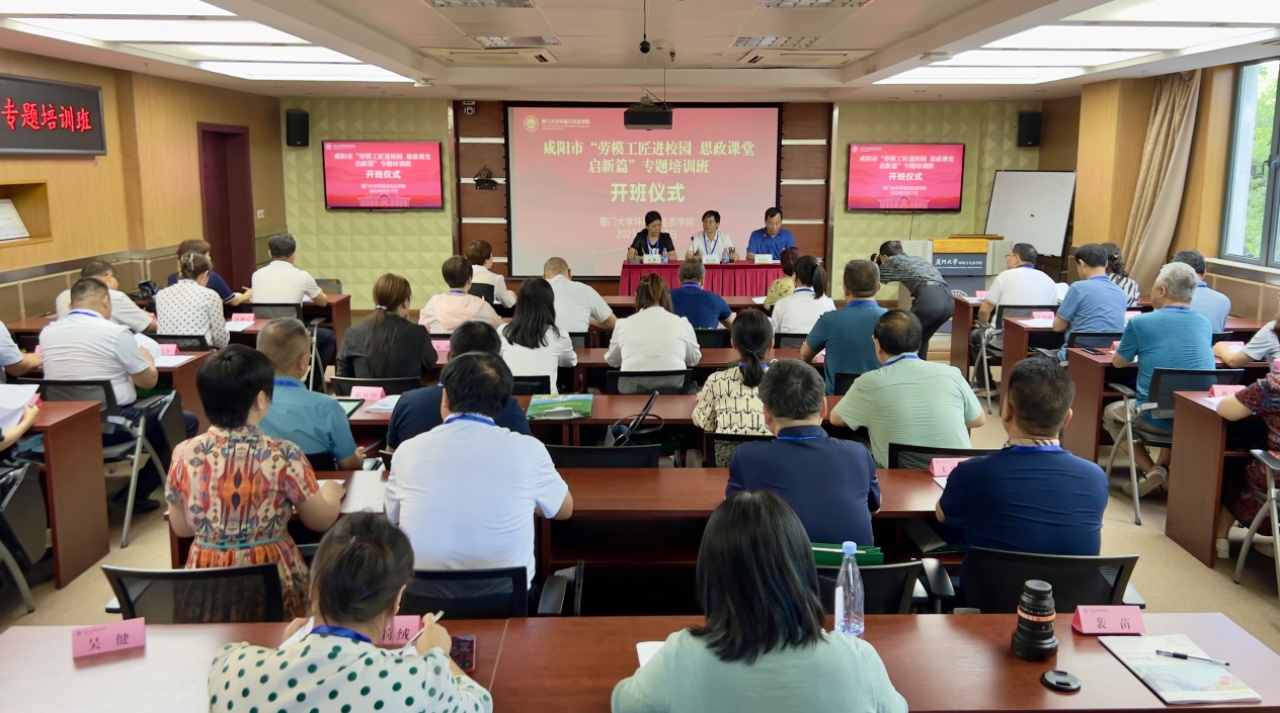 7月17日,陕西省咸阳市“劳模工匠进校园 思政课堂启新篇”专题培训班在厦门大学开班。咸阳市人大常委会副主任、市总工会党组书记、主席田一泓出席并讲话,厦门大学环境与生态学院党委副书记蔡虎堂致辞,咸阳市总工会党组副书记、常务副主席张静主持。全市50名在职劳模、工匠代表参加培训。