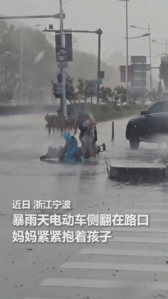 帮母亲俩扶起电动车