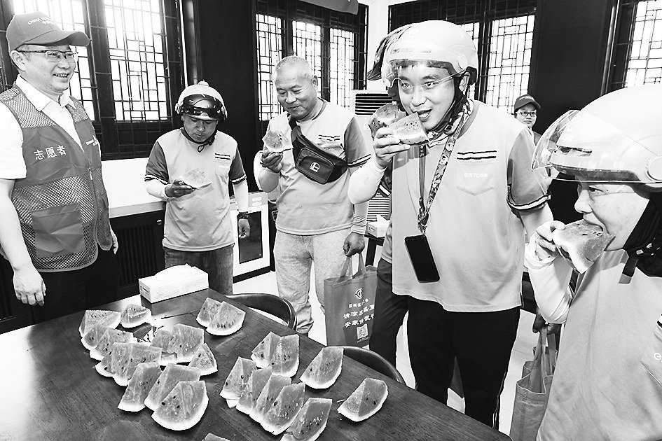 “来喝一杯解暑的绿豆汤。”“切好的西瓜甜得很!”7月17日,在安徽阜阳市颍州区总工会和阜阳铁塔公司联合开展的“驿站送清凉 关怀暖人心”骑士节关爱活动现场,骑手们开心地说。