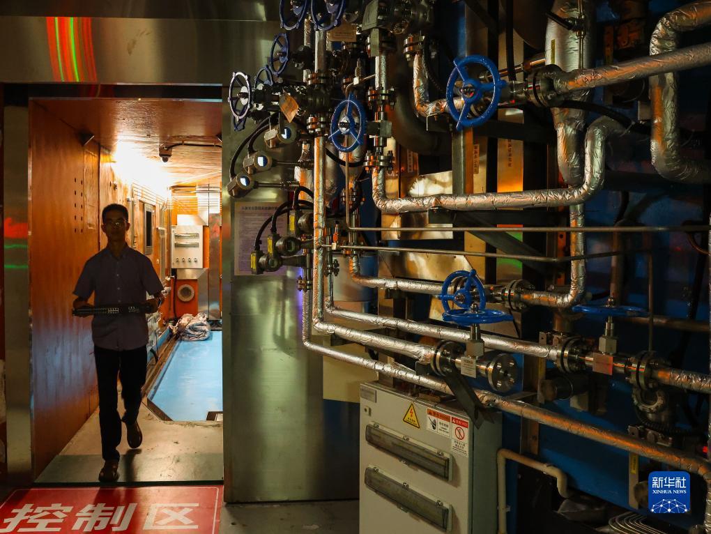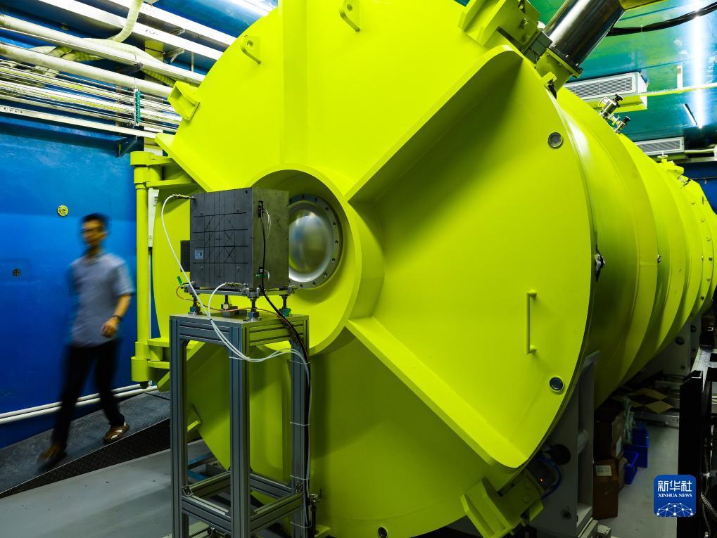 科研人员从中国散裂中子源的微小角中子散射谱仪散射腔系统旁经过(7月18日摄)。