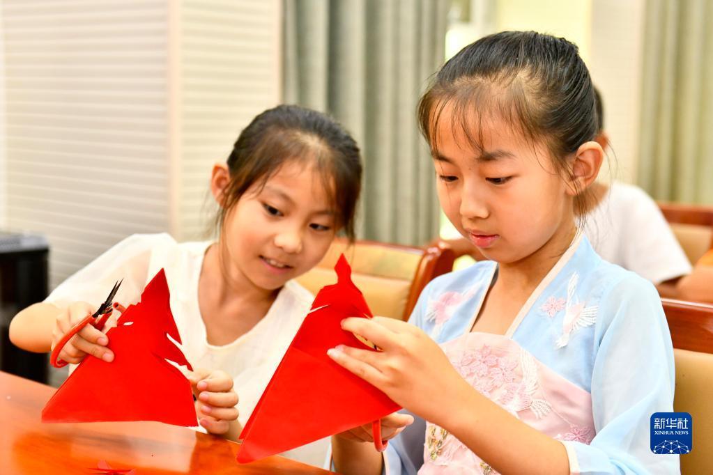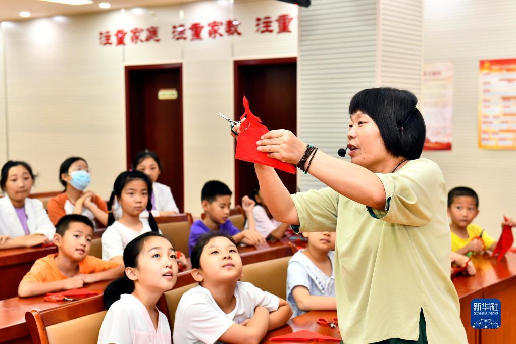 7月26日,在莒县城阳街道岳家村“小草学堂”,孩子们在学习剪纸。