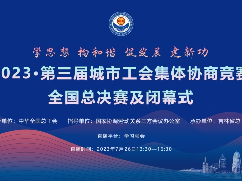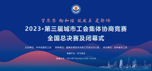 直播回顾丨第三届城市工会集体协商竞赛全国总决赛及闭幕式 第三届城市工会集体协商竞赛,是由中华全国总工会主办,吉林省总工会承办,在国家协调劳动关系三方会议办公室指导下,以城市代表队为参赛主体开展的全国性集体协商业务技能竞赛。7月26日(周三)13:30,第三届城市工会集体协商竞赛全国决赛将在吉林长春进行,中工网首页、微博、视频号同步直播!