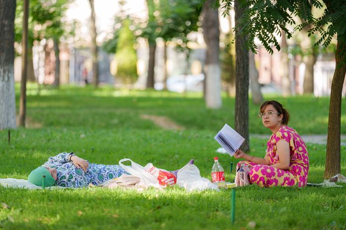 7月23日,人们在乌兹别克斯坦首都塔什干一处草地避暑消夏。新华社发(格奥尔吉·纳马佐夫摄)