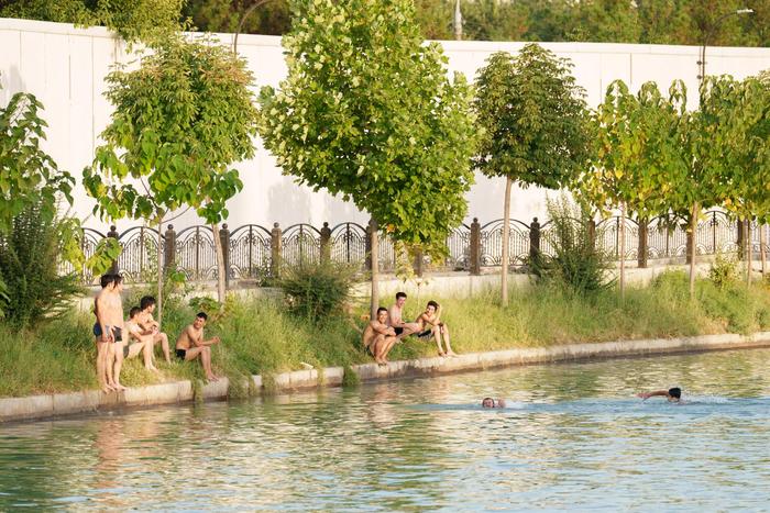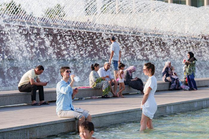 7月23日,在乌兹别克斯坦首都塔什干,人们在水边避暑消夏。新华社发(格奥尔吉·纳马佐夫摄)
