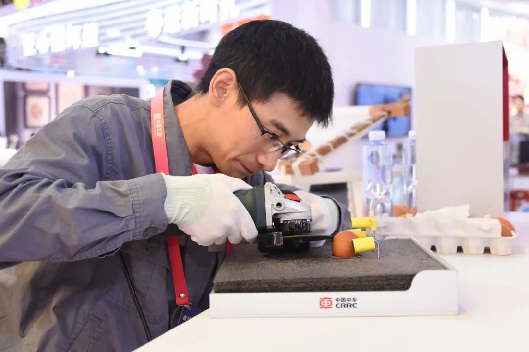 生鸡蛋上刻字,壳穿而膜不破。来自中车株洲电力机车有限公司冷作工高级技师易鹏,使用电动角磨机在生鸡蛋上刻字,一个简单的字最短只需要2分钟。记者看到,他现场刻出了“大国工匠”4个字。易鹏说,要做到壳穿而膜不破,心要静、眼要准、手要快。