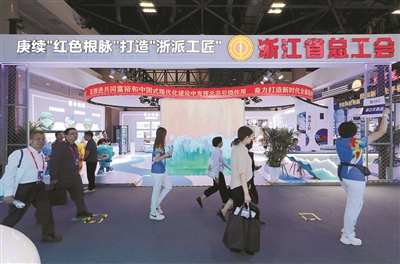 此次大会上,浙江省总工会展区以“庚续‘红色根脉’,打造‘浙派工匠’”为主题,展现以“浙派工匠”为代表的高素质职工队伍建设的卓越成果,展示部分优秀劳模工匠的典型事迹以及创新成果。