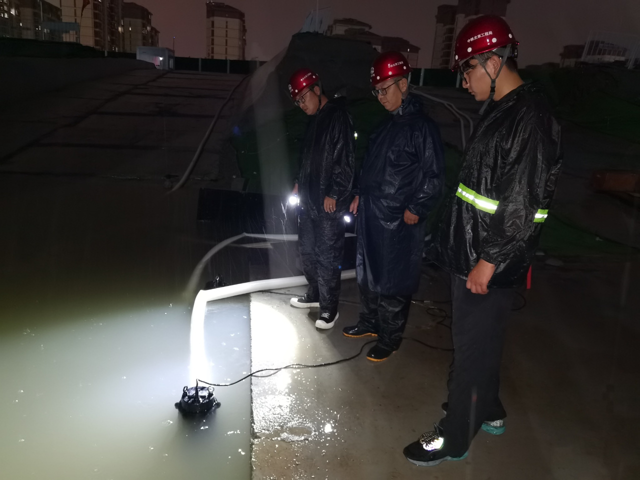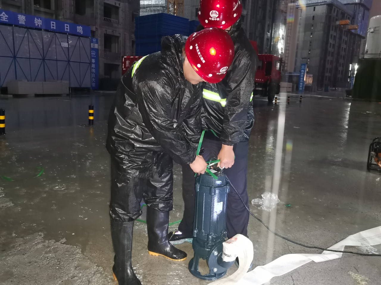 项目部紧急召开会议研究安排,分小组在车库支路降板南北、东西端头设置积水坑(汇水点);提前在积水坑内设置水泵,临电电工雨前对水泵三级箱进行供电和上锁。现场设置抽水水泵30台,不间断进行抽水;沙袋灌装使用570个,做好重点区域防护,防止车库顶板雨水顺坡道出入口汇入车库;防汛应急人员对现场值班值守,实行24小时盯控,根据现场雨量汇入情况及时增减水泵数量,确保安全度过汛期。