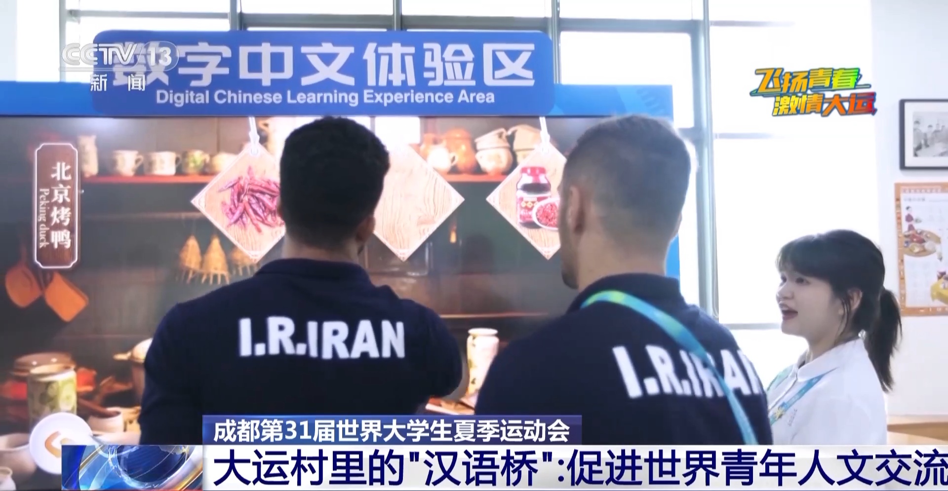 在“汉语桥”中文学习互动体验区,外国运动员们还能当一回大厨,虚拟制作北京烤鸭、宫保鸡丁等中国名菜;在合影区,当屏幕中心出现卡通熊猫的影像时,总会引来大家的惊叹欢呼。此外,唱中文歌、兑换成都当地大学徽章等环节,也吸引着外国运动员们一一打卡体验。大家在这里玩得尽兴,留下美好记忆,汉语桥也为世界青年学习中文和相互交流搭建起语言之桥、文化之桥、友谊之桥。