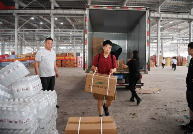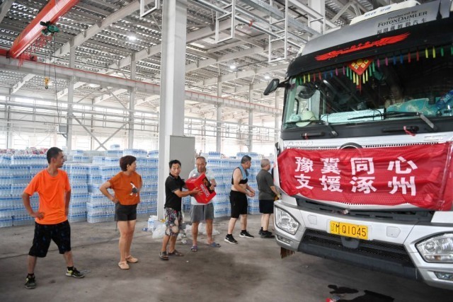 当日,大批来自全国各地的捐赠物资运抵河北涿州,支援当地受灾群众。