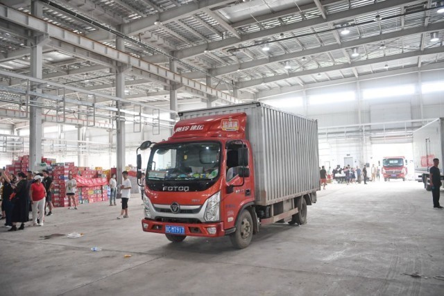 ↑8月5日,捐赠物资的车辆在河北省涿州市钢研物资储备点内行驶。