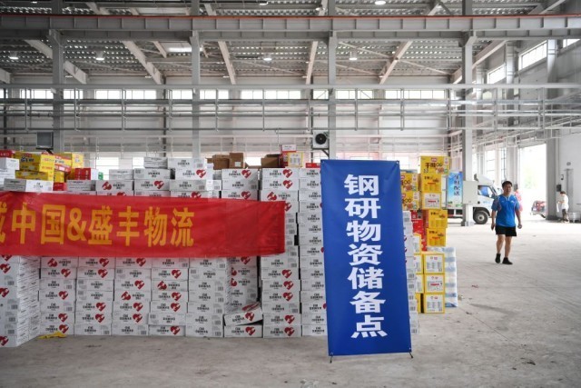 ↑这是8月5日拍摄的河北省涿州市钢研物资储备点内存放的捐赠物资。