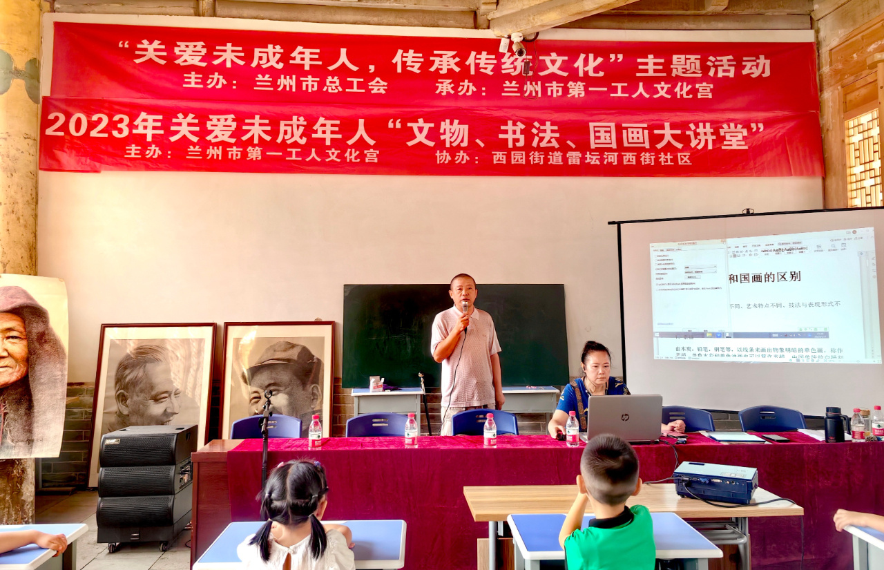 为充分发挥工人文化宫的职能和文化阵地作用,丰富职工子女暑期生活,8月4日,由兰州市总工会主办,兰州市第一工人文化宫承办,雷坛河西街社区、国辉书画工作室、廖智军工作室协办的“2023年关爱未成年人——文物保护、国画、书法大讲堂”活动在兰州市第一工人文化宫举办,有60多名职工子女参加。