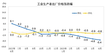 国家统计局数据显示,中国6月份PPI同比下降5.4%。
