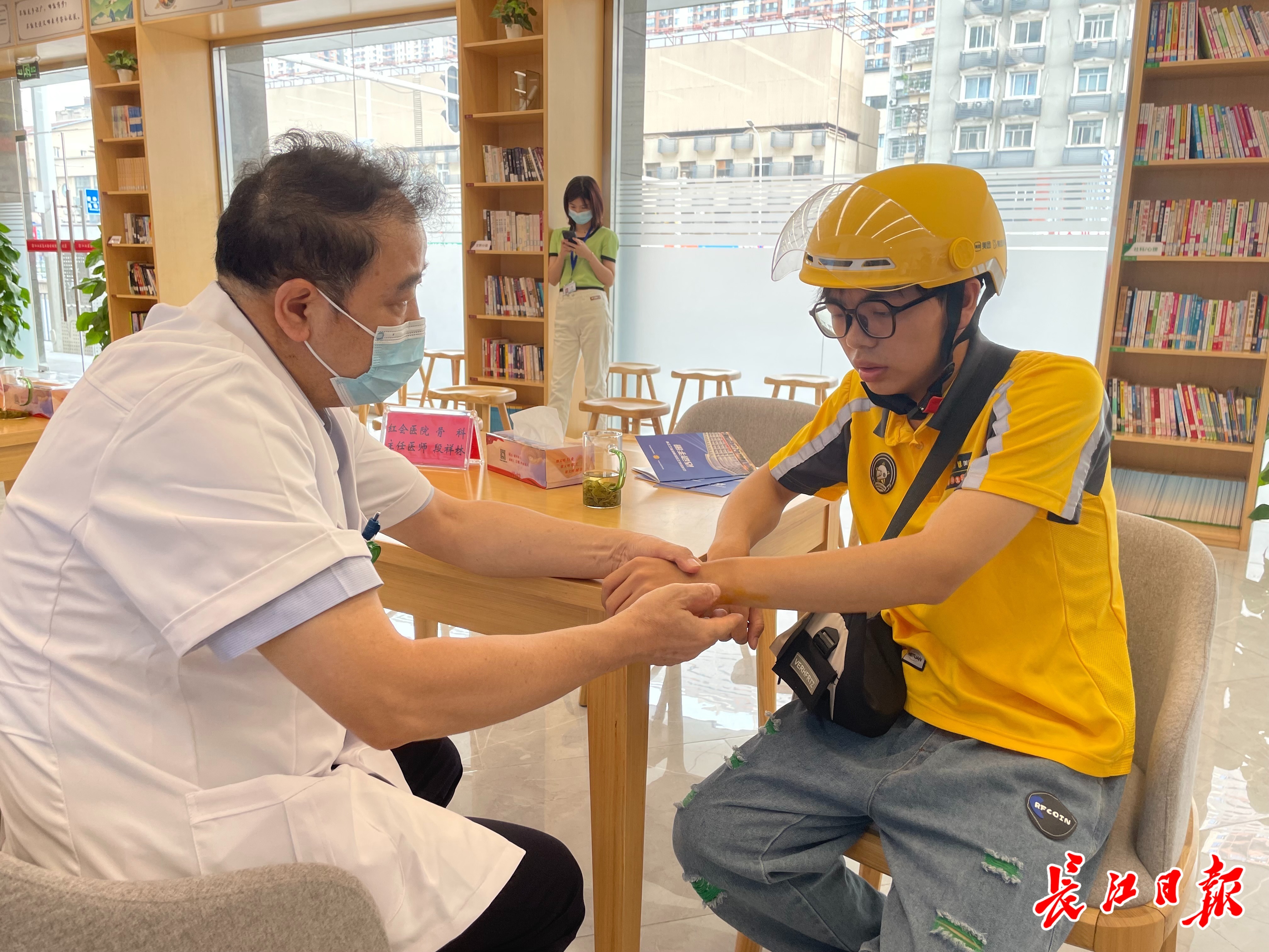 “医生,我前几天送餐时不小心把手腕扭伤了,能否帮忙看看。”外卖骑手黄志强来到骨科专家吕希俊的问诊台当面咨询。“伤得不重,还好!这个可以不用药,建议你戴个手腕套保护一下。”吕希俊托起他的手腕仔细检查后,当场给出诊断意见。江汉区总工会日前在区职工之家开展健康义诊活动,邀请武汉市红十字会医院骨科、急诊科的医疗专家现场为骑手义诊,深受户外劳动者欢迎。