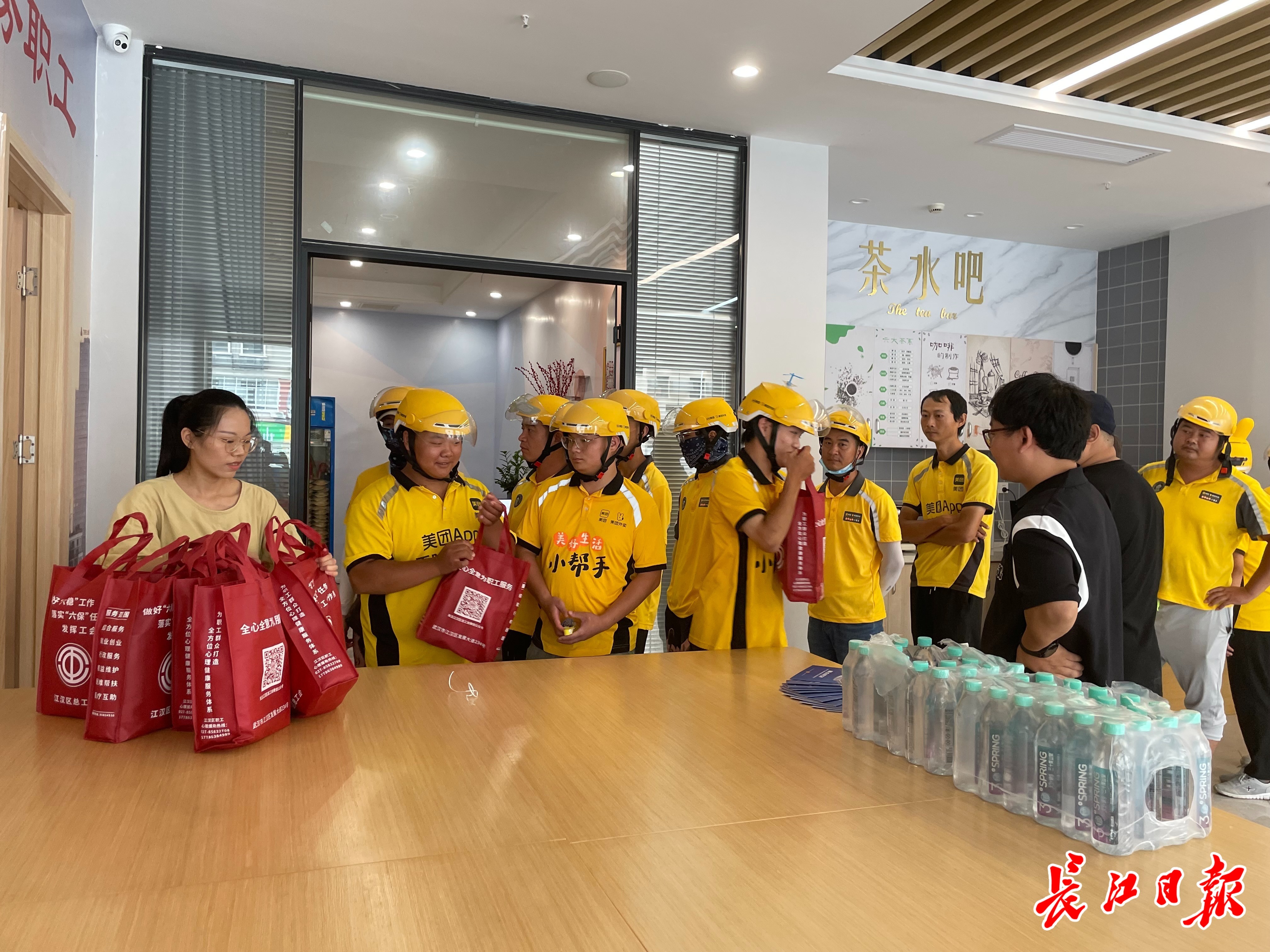 外卖骑手在江汉区职工之家领取防暑降温物资。记者谭德磊 摄