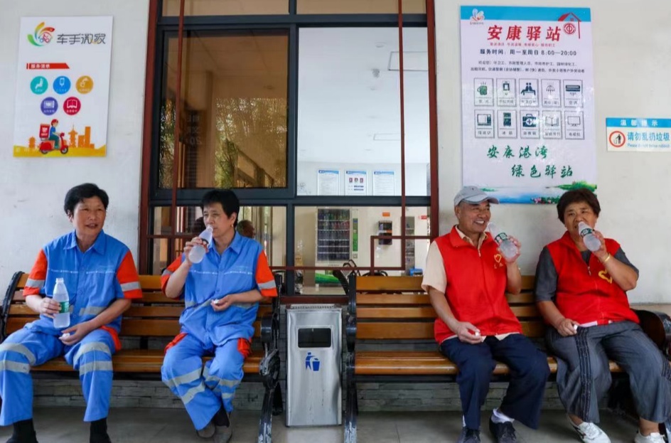 “能够在有空调的休息室里乘一会儿凉,真是太舒心了!”8月7日上午,刚保洁完的环卫工人陈洁,来到江苏省宿迁市泗洪县初心广场附近的“工会小站”休息。