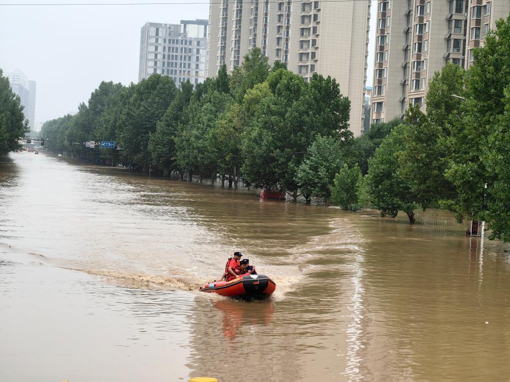 8月2日,救援人员在涿州市内乘冲锋舟救援被困群众。新华社记者 高博 摄