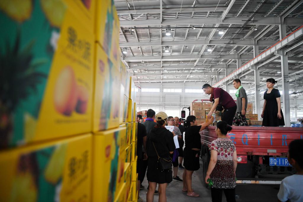 8月5日,工作人员和志愿者在涿州市钢研物资储备点内将捐赠物资装车外运。新华社记者 牟宇 摄