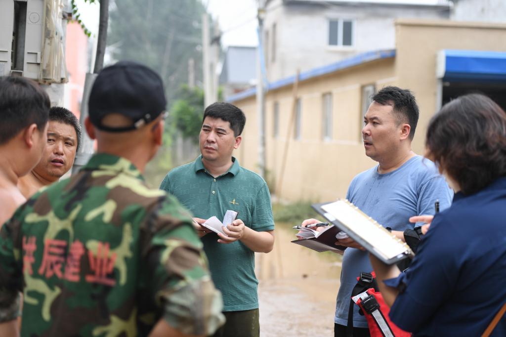 8月3日,新华社记者高博(右三)和同事在涿州市码头镇北高庄村内采访受灾群众。新华社记者 牟宇 摄