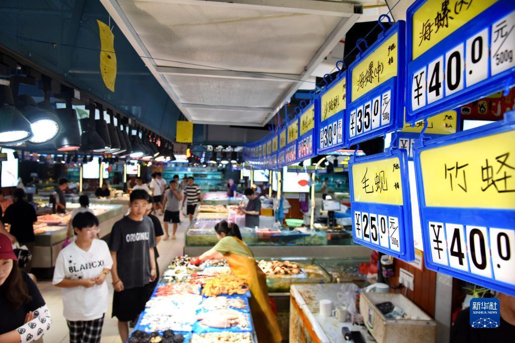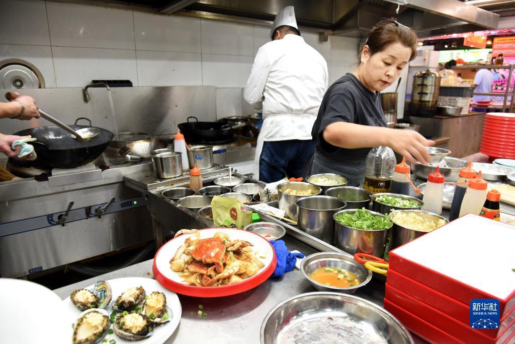 8月7日,青岛市市南区浮山所市集一店家在为顾客加工海鲜。