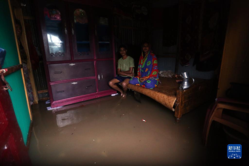 8月8日,在孟加拉国吉大港,居民坐在被洪水侵袭的家中。
