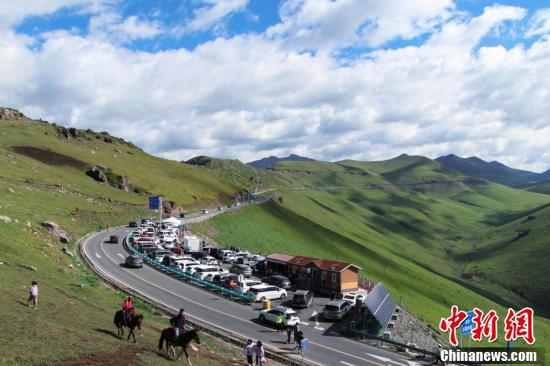 眼下独库公路仍处旅游旺季,每天平均进出车辆近两万辆。图为独库公路的一处停车点,游客纷纷停车打卡。