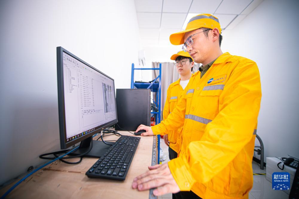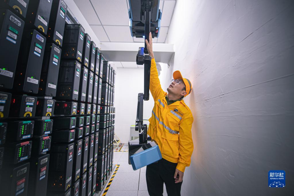 8月17日,杭州电务段工作人员在杭台高铁中继3站巡检时查看机器人实时监测的机房情况。新华社记者 江汉 摄