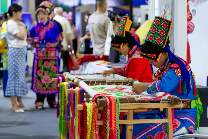 8月17日,产业成果馆汉中展区的非遗传承人展示刺绣技艺。新华社记者逄杰 摄