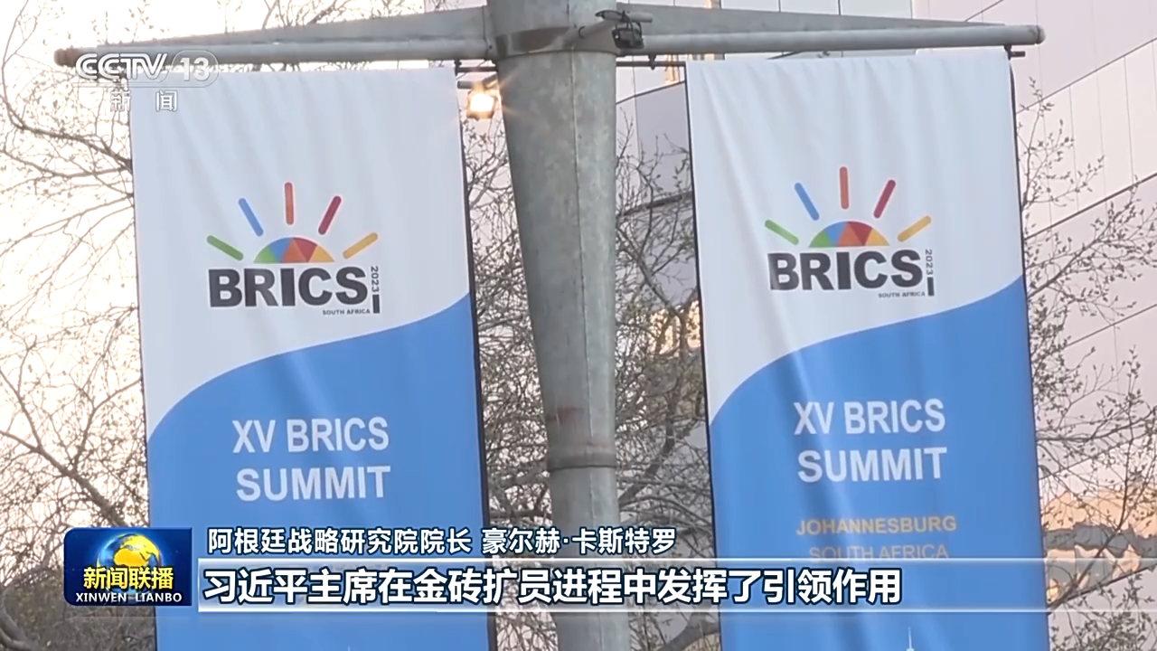阿根廷战略研究院院长 豪尔赫·卡斯特罗:习近平主席在金砖国家领导人第十五次会晤上强调了让更多国家加入到金砖大家庭的必要性,习近平主席在金砖扩员进程中发挥了引领作用,此次金砖将纳入的阿根廷、沙特、伊朗、阿联酋、埃塞俄比亚和埃及是属于三个不同大陆的六个重要国家,这具有重大地缘政治意义。