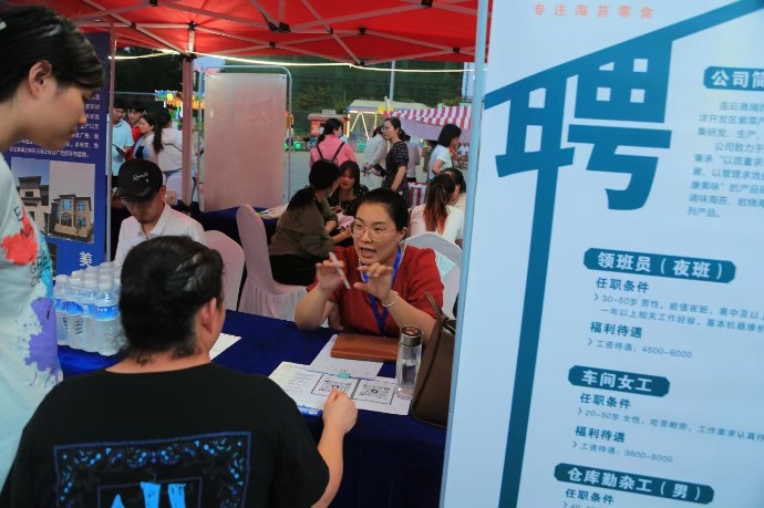 8月25日晚,江苏省连云港市赣榆区人社局、区总工会主办的“‘榆’快就业 ‘职’等你来”夜市招聘会在赣榆区万达广场举办。江苏新海石化、连云港东磁新能源、连云港神舟新能源等64家企业参加,提供1200余个岗位,涉及工业设备、安全生产、制造、服务等多个领域,共吸引了近2000名求职者前来应聘。(工人日报-中工网记者黄洪涛 通讯员伏在江 邵世新)