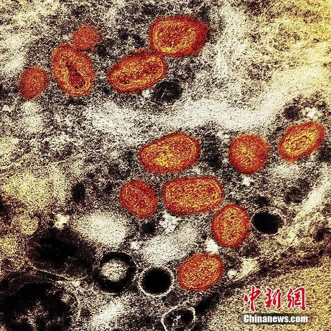 资料图:当地时间2022年7月26日,美国马里兰州,在实验室培养的感染细胞(棕色)中发现的猴痘颗粒(橙色)的彩色透射电子显微图。图片来源:视觉中国