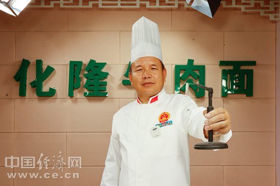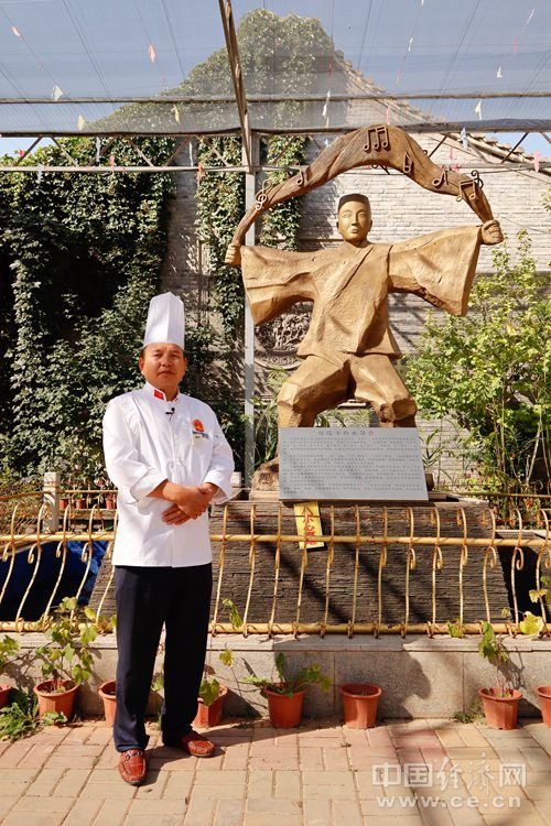 韩玉龙与化隆牛肉面雕像。中国经济网记者 李凡摄