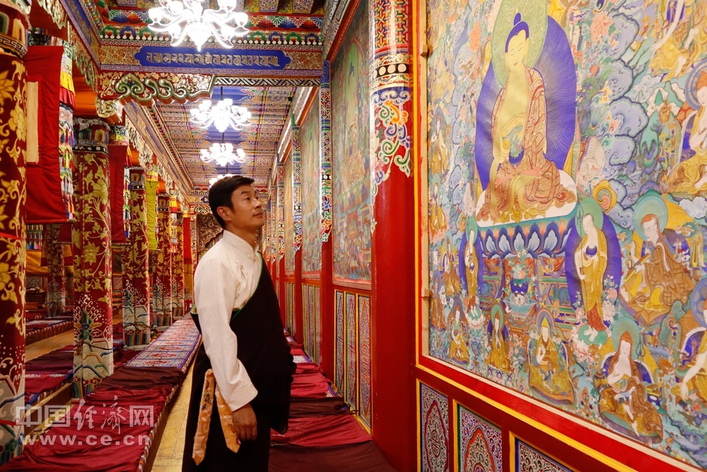 完德尖措在隆务寺内观看他的作品《释迦牟尼佛与二圣六庄严》。中国经济网记者 李凡摄。