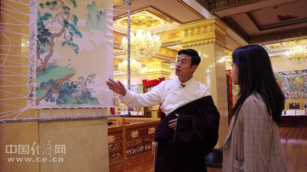 完德尖措在隆务寺内为记者讲解他的作品《释迦牟尼佛与二圣六庄严》。中国经济网记者 李凡摄。