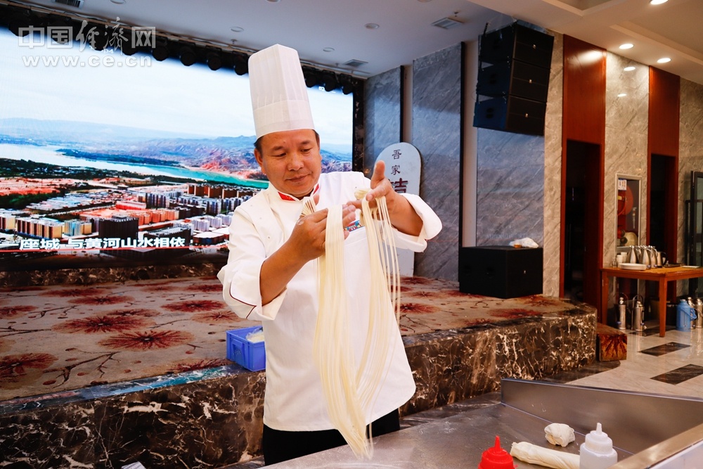 韩玉龙展示拉面穿针技艺。中国经济网记者 李凡摄。