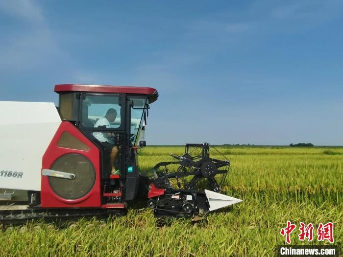 图为在江西省上饶市鄱阳县再生稻生产基地,收割机正在收割再生稻。鄱阳县融媒体中心供图