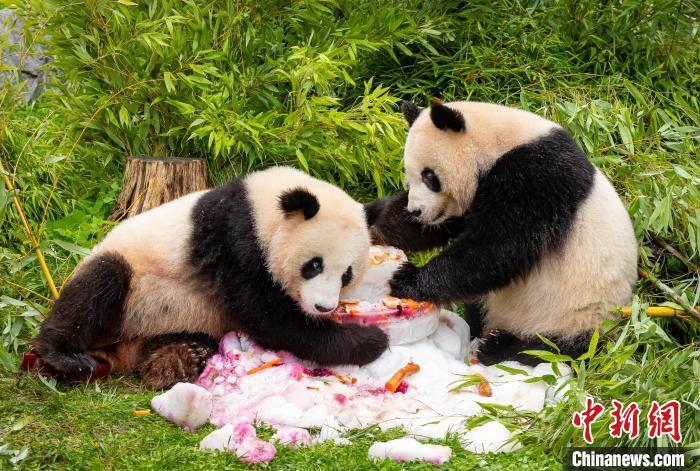 图为8月31日,旅德大熊猫双胞胎“梦想”“梦圆”在品尝特制的“生日蛋糕”。(柏林动物园供图)