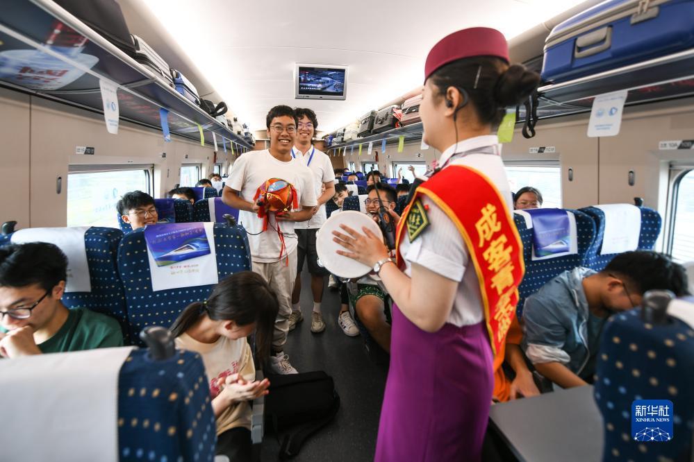 9月1日,在成都东站开往上海虹桥站的G3286次列车上,同济大学新生在车厢内玩“击鼓传花”的游戏。