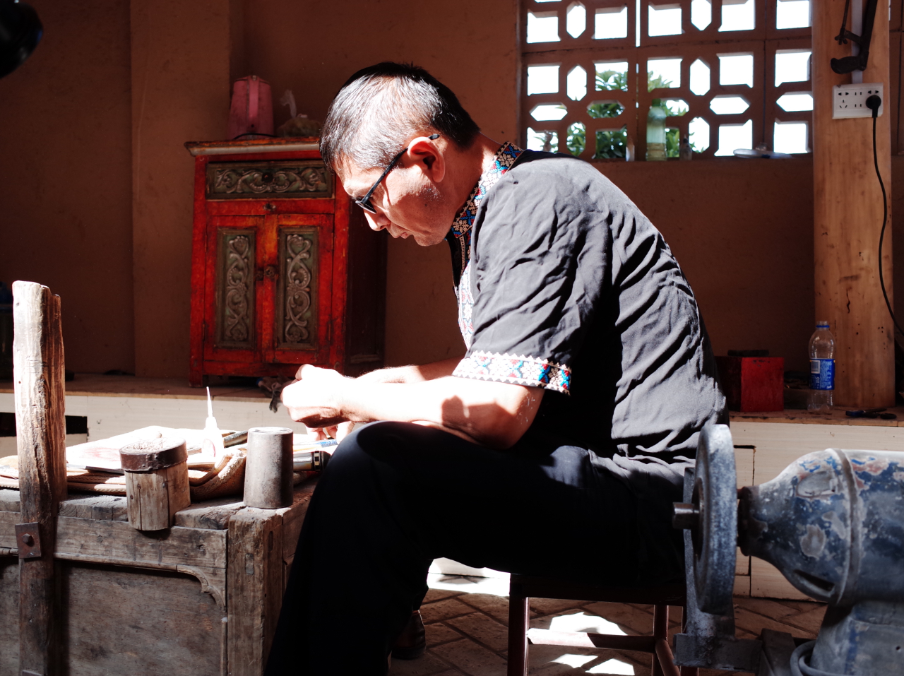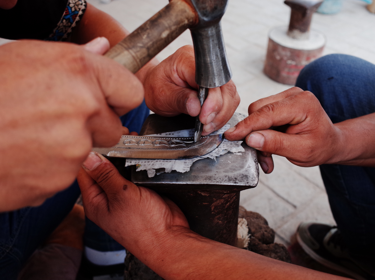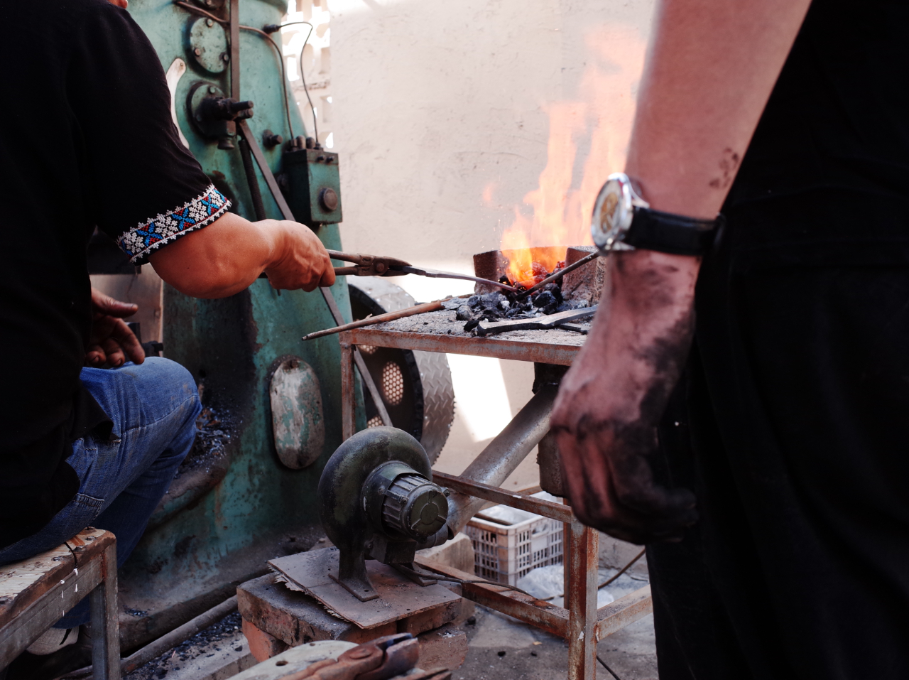 英吉沙小刀做工精细、造型美观,对制作流程中各环节的要求颇高,锻打、接合、淬火、回火等方面均需达到炉火纯青的地步。具体流程为:选材——煅烧——捶打——接合——二次锻打——淬火——打磨——锉平——装饰刀身、刀柄——完型。