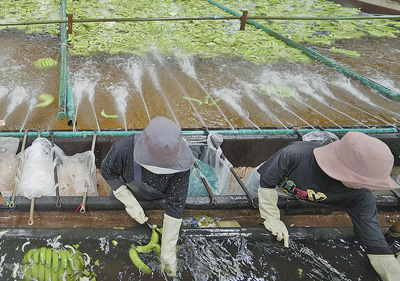在斯登德朗县的地泽香蕉园,工人正在清洗香蕉。人民日报记者 赵益普 摄