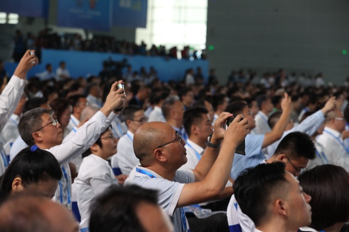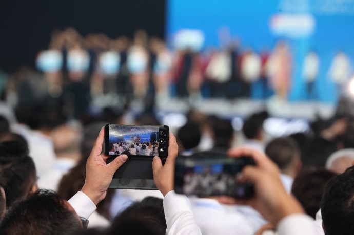图为开幕式现场观众举起手机记录会场。工人日报-中工网记者 吴凡 摄
