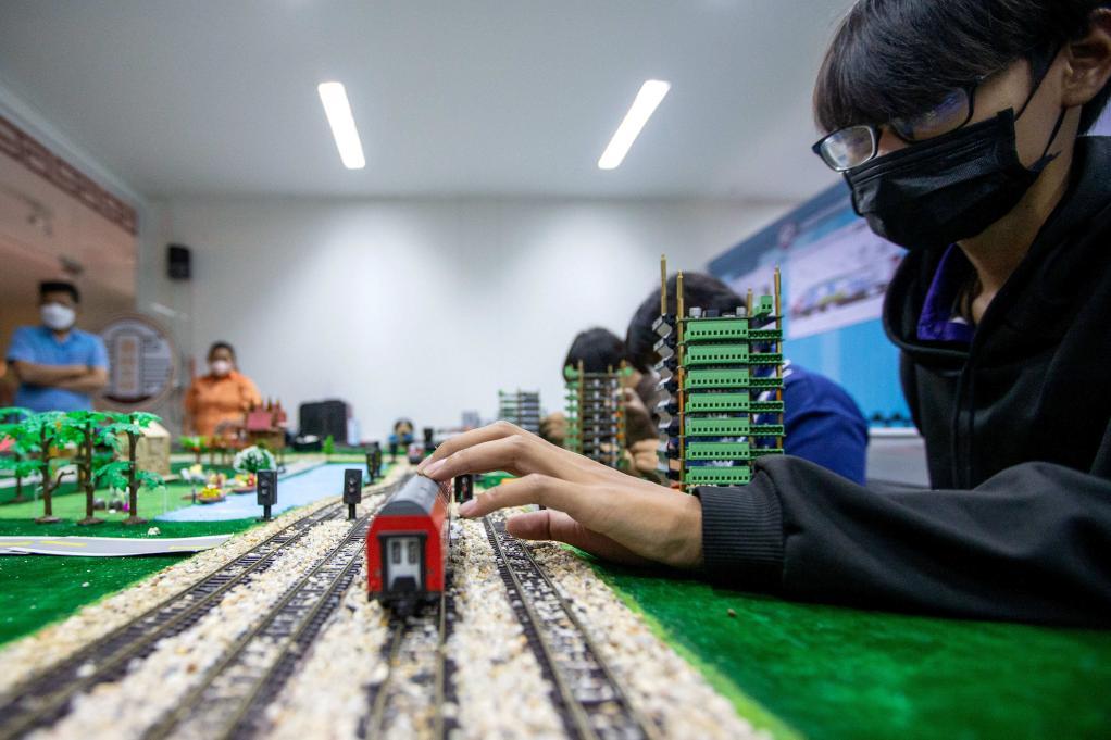 3月14日,在泰国大城府大城技术学院鲁班工坊铁院中心,学生在高铁运营沙盘教学区学习。新华社记者 王腾 摄