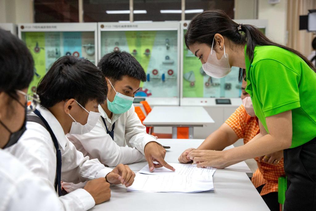 3月14日,在泰国大城府大城技术学院鲁班工坊,教师(右一)给学生上课。新华社记者 王腾 摄