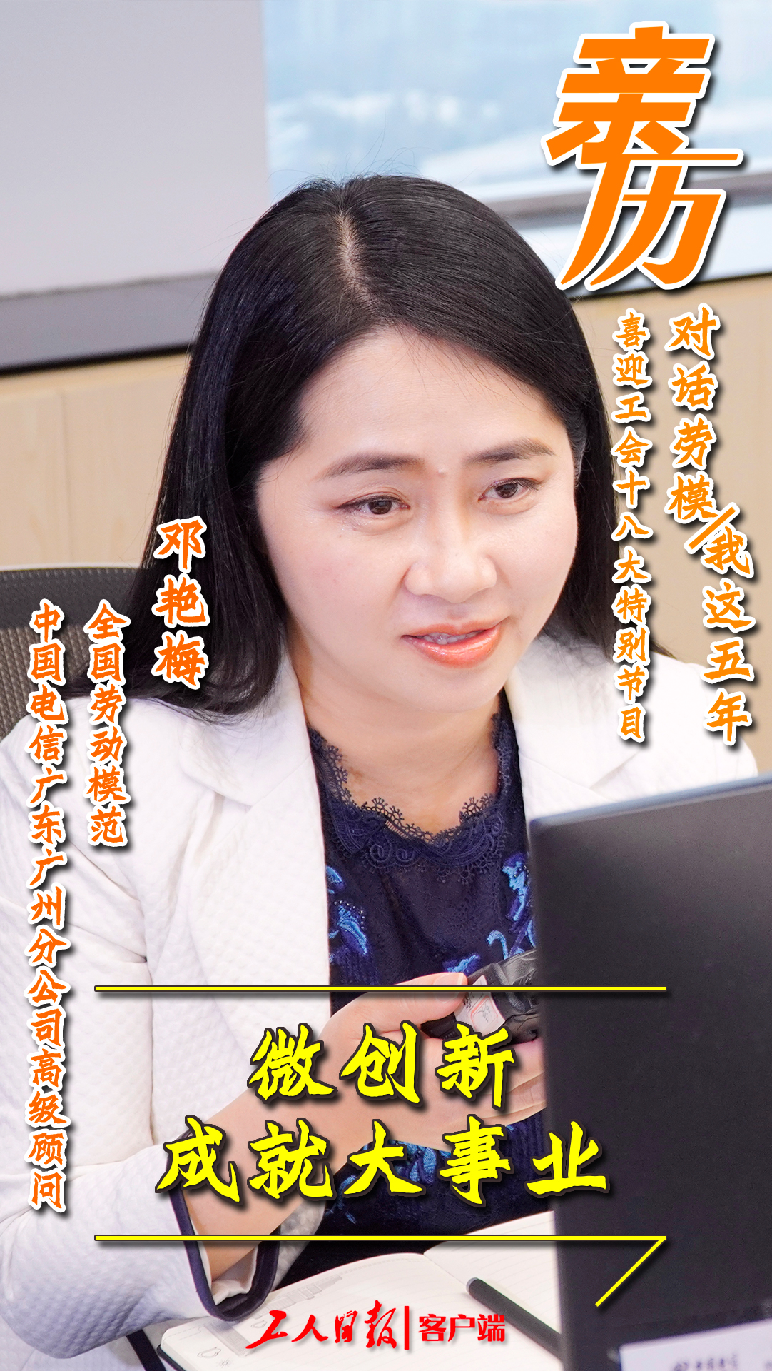 为生动诠释劳模精神、劳动精神、工匠精神,展现新时代劳动者风采,喜迎中国工会十八大召开,今日起,工人日报融媒体中心陆续推出《【亲历】喜迎工会十八大特别节目 ·对话劳模:我这五年》系列短视频,聆听新时代劳模工匠们的奋斗成长故事,敬请垂注。今日为第一期:《微创新成就大事业》