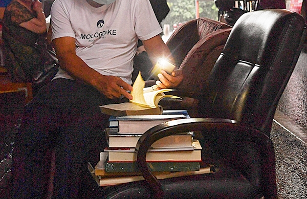 雨天光线昏暗,读者借助手机电筒看书