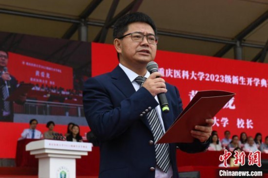 图为重庆医科大学校长黄爱龙在开学典礼上寄语新生“再赴新程”。中新网记者周毅 摄