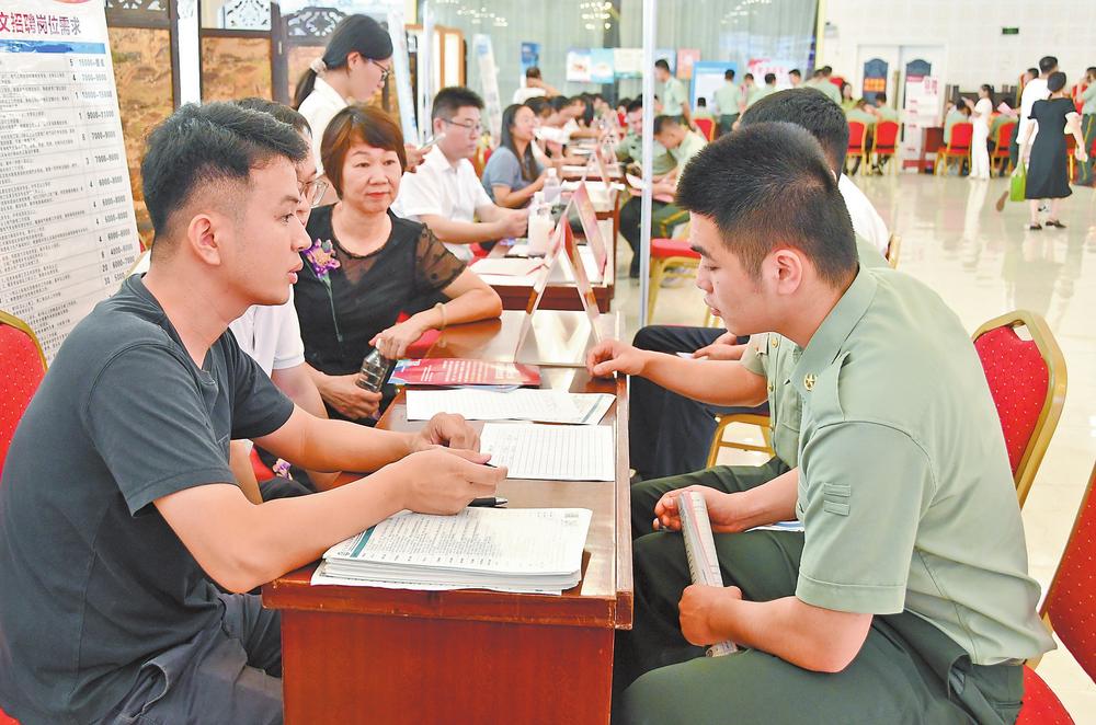 9月21日,退役士兵在招聘会上向用人单位咨询岗位情况。