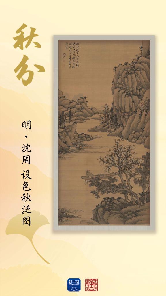 这幅藏于沈阳故宫博物院的明代沈周所作《设色秋泛图》,画面上山峦起伏,山石峭壁,树木丛生,山涧溪水潺潺,一雅士乘舟远望,卧看层峦叠嶂,草木秋色。萧山红叶,澄水长天,船中雅士就生活在这如梦的山水画中。